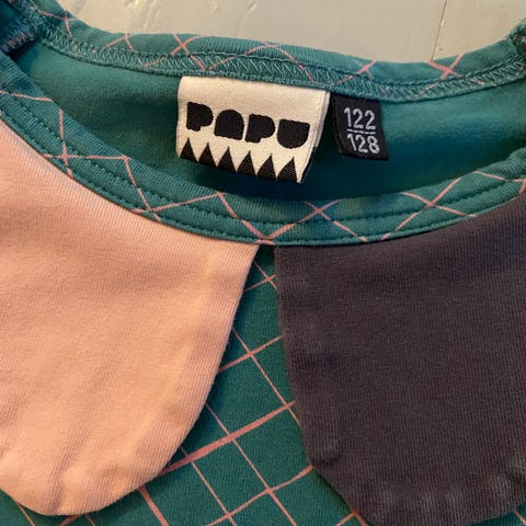 Papu mekko tytöille, koko 122. Väriltään musta tai hyvin tumma sävy, jossa vaalea kuosikuvio. Materiaali on puuvillaa. Lyhythihainen, väljä malli, joka sopii arkeen ja vapaa-aikaan. Soveltuu käytettäväksi esimerkiksi legginssien tai sukkahousujen kanssa.