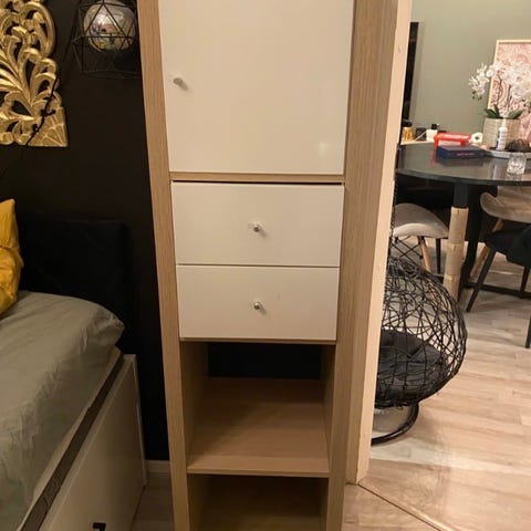 Kallax hyllykkö, jossa jalat ja liimattu mäntylevy päälle. Mukana kolme sisäkaappia ja lokerikko kahdella vetolaatikolla. Pieniä ruuvin jälkiä, joista kuva.
