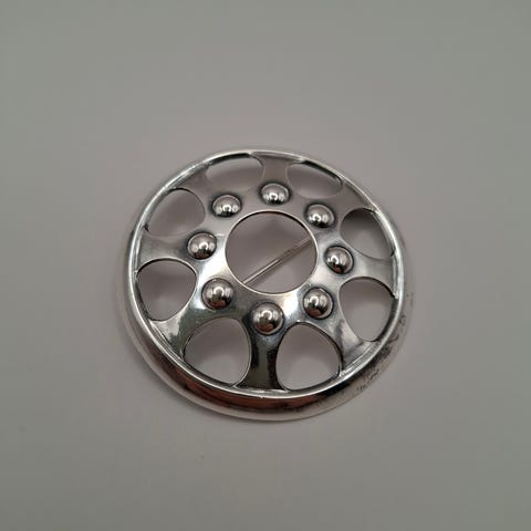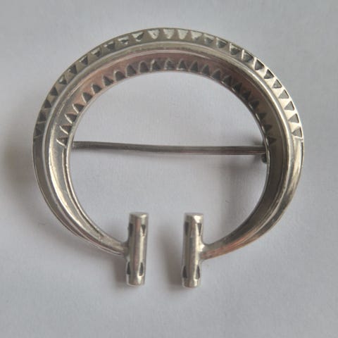 Kaksi hopeasolkea, halkaisija 49 mm, 925-leima ja hopealeima. Toiseen on kultasepällä lisätty pieni riipuslenkki, jotta voi pitää myös kaulakoruna. Yhteensä 230€.