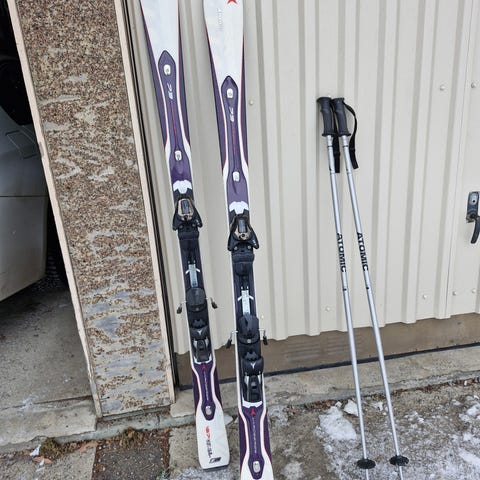 Kunto hyvä, käytön jälkiä suksien pohjassa ja hieman monoissa. Erittäin toimiva setti mäkeen.
