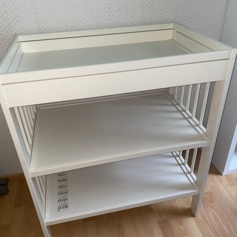 IKEA hoitopöytä valkoinen. Hoitotaso ylhäällä korotetuin reunoihin, alla avohyllyjä ja vetolaatikoita vauvan tarvikkeiden säilytykseen. Mitat noin: leveys 90 cm, syvyys 79 cm ja korkeus 100 cm. Soveltuu vauvan hoitoon ja lastenhuoneen säilytyskalusteeksi.