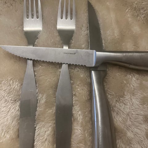 Kahdeksan kpl Hackmanin pihviaterimia (haarukka+veitsi).