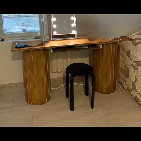 Myydään pieneen tilaan nurkkapöytä puuta. 1 jalalla ja kiinnitys seinään. löytyy kulumaa. voi maalalla mieleisekseen.