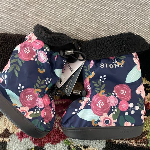 Stonz lasten tossut, koko XL. Väri musta. Kengissä on kumipohja ja päällinen tekstiilimateriaalia. Kiristettävä suuaukko auttaa pitämään kengät jalassa.