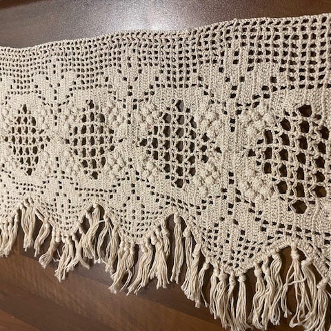 Pitkä käsinvirkattu kukkakuvioinen verhokappa. Isoon ikkunaan mittatilaustyönä tehty. Toimitus välillä Maaninka-Siilinjärvi-Kuopio tai Nouto. Toridiili ja MobilePay käy.