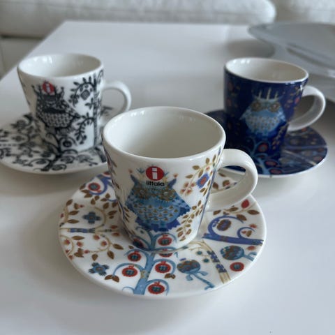 Iittala Taika kahvikuppi ja lautanen, joissa pöllöaiheinen koristekuvio. Settiin kuuluu kaksi kuppia ja kaksi aluslautasta, valkopohjaisella ja tummansinisellä kuosilla. Astiat ovat posliinia ja soveltuvat esimerkiksi kahvin tai teen tarjoiluun arki- ja juhlakäyttöön.Mmm, hinta 25€ setti.
