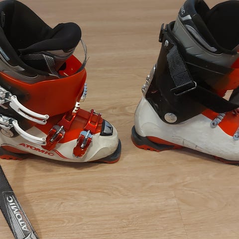 Atomic Comfort fit naisten laskettelumonot, sisämitta 245-250mm. Vastaa noin 39 kokoa. Neljällä soljella ja leveällä tarrakiristyksellä. Väriltään musta-valkoinen, erittäin mukava ja pehmeä sisäkenkä. Säädettävät soljet.
