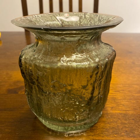 Iittala lasimaljakko, kirkas lasi. Maljakossa on ulkopinnalla vaakasuuntaiset urat ja ylhäältä avautuva, kartiomainen muoto. Soveltuu esimerkiksi kukka-asetelmille tai sisustusesineeksi. Kuvat näyttävät mitat halkaisijalle ja korkeudelle mittanauhan avulla.