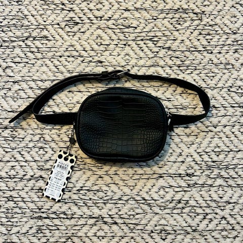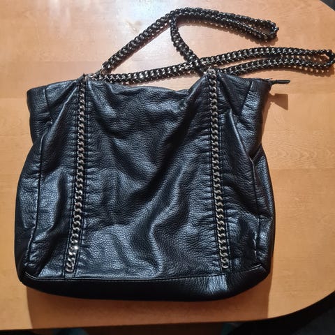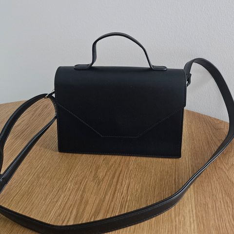 Pieces musta olkalaukku, leveä punottu kuvio. Laukussa on vetoketjusuljenta, sisäpuolella on vuori ja vetoketjutasku pienten tavaroiden säilytykseen.
