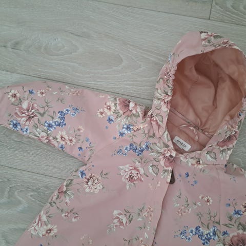 Soma Newbien 74 cm haalari kevään ja kesän ulkoiluihin. On ollut käytössä myös hiekkalaatikolla, joten vaaleassa kankaassa näkyy useassakin kohdassa tummempia jälkiä läheltä katsottuna. Yleisilme kuitenkin ihan siisti, kangas on ehjää ja vetoketju toimii hyvin. Yhtä saumaa ommeltu noin 3-4 cm kiinni, kun se aukesi (ks. kuva) Pesty hajusteettomalla pesuaineella.
