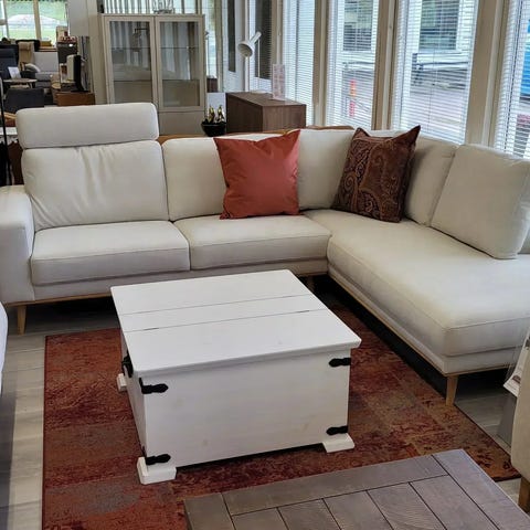 Iso kulmasohva, tilattu Kodin1 viimevuonna. Merkki ilmeisesti Scandi Days ja nimi Armunia. Kulma on vasemmalla.