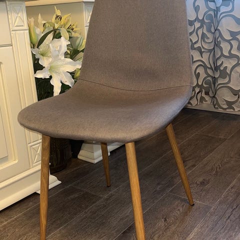 Valkoinen ikean tuoli. Jonkin verran kulumisen jälkiä, sekä kankaat vaativat varmaan jonkinlaista käsittelyä