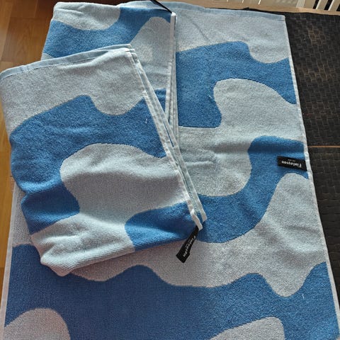 Kaksi käsi ja kaksi suihku pyyhettä. Ollut käytössä ja joitain yksittäisiä langan purkauma kohtia voi olla mutta kuitenkin siistit ja toimivat.