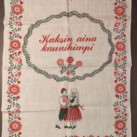 Myydään käyttämätön Aarikan vihreäkuvioinen Pässit kedolla -kuosin keittiöpyyhe. Pyyhkeen mitat ovat 50 cm x 70 cm. Hintapyyntö on 12 euroa ja lähetän tarvittaessa postikuluja vastaan.
