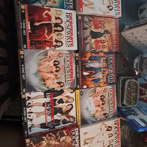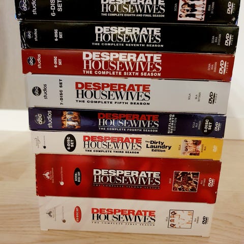Desperate Housewives dvd-boksisetti, joka sisältää televisiosarjan kaudet 1–6. Jokainen kausi on omassa dvd-kotelossaan. Sopii dvd-soittimella katsottavaksi. Hyvä kokonaisuus sarjan seuraamiseen alusta useamman kauden ajan.