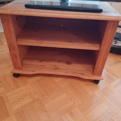 Vanhan ajan, metallirunkoinen tv-taso lehtitelineellä. Pöytälevyssä pari osumaa, jotka saa halutessaan peittoon vaikka liinalla tai sitten vaihtaa koko levyn. Pyörät kaipaavat myös puhdistusta.