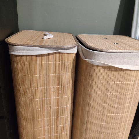 Kannellinem pyykkikori / säilytyskori pajua. Korkeus n. 40 cm, leveys n. 40 cm, syvyys n. 30 cm.