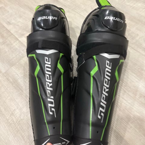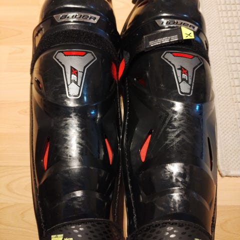 Bauer Vapor X800 jääkiekkosäärisuojat, koko 15" (noin 38 cm). Väri valkoinen/punainen mustin yksityiskohdin. Säärisuojissa on säädettävät remmit kiinnitystä varten ja muotoiltu suojaus säärille ja polville. Soveltuvat jääkiekkoon ja muuhun jääurheiluun, jossa tarvitaan säärien suojaa.