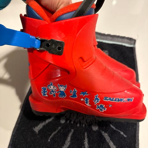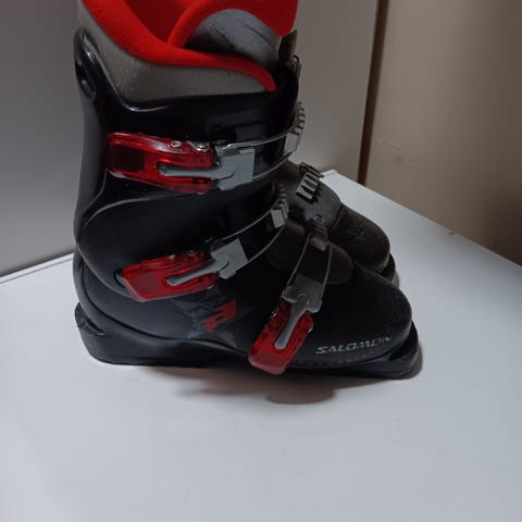 Salomon lasten laskettelumonot. Monot ovat väriltään mustat punaisella sisäosalla ja harmailla yksityiskohdilla. Kengissä on useampi säädettävä solki jalan tukemiseen ja istuvuuden säätämiseen. Soveltuvat lasten rinnelasketteluun tavallisten alppisuksisiteiden kanssa.