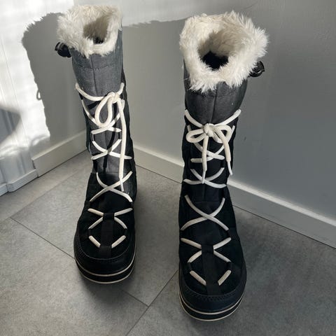 Lämpimät, korkeavartiset talvisaappaat. Koko 39. Kumiterä, vedenpitävä tekstiilivarsi ja irroitettava huopavuori, joka on helppo kuivattaa tarvittaessa. Huopavuorien teddykarvaisissa reunuksissa kulumaa, muutoin yleiskunto siisti ja hyvä.