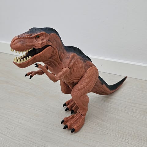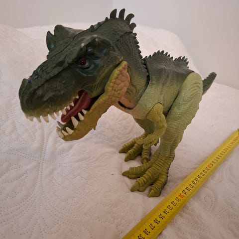 Lapsi myy lelujaan. Tässä kyseessä Tyrannosaurus Rex, mitta pään kärjestä hännän kärkeen yli 50cm.
