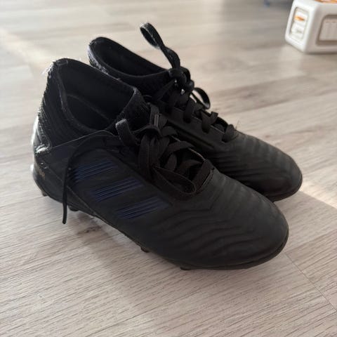 Adidas Predator jalkapallokengät. Väri musta–pinkki. Päällinen sukkamallinen ilman nauhoja. Nappulapohja on suunniteltu luonnonnurmelle tai tekonurmelle. Kengissä on Predator-tekstuurit pallokosketuksen parantamiseksi. Koko 30