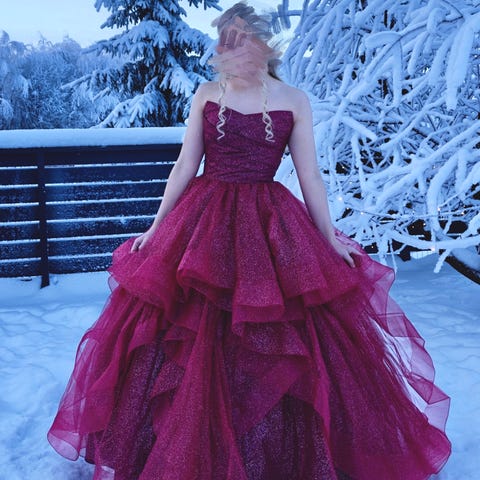 Ateljee Katariinasta ostettu wanhojentanssimekko, koko M/38. Kahdesti tanssittu. Mekko on tummansininen, glitteriä kauttaaltaan. Mallissa on vartaloa myötäilevä yläosa ja useasta kerroksesta koostuva runsas helma. Olkaimet ovat ohuet ja takana ristikkäin. Täysin ehyt.