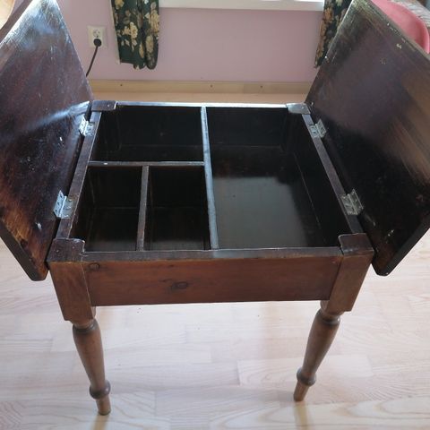 Pöydän korkeus 76cm ja hieman soikea pöytälevy 44*40cm. pöytälevy hieman vino ja kuivumishalkeama n15cm matkalla. Pöydän jalka 1800 luku ja pöytälevy myöhempi. Vain nouto