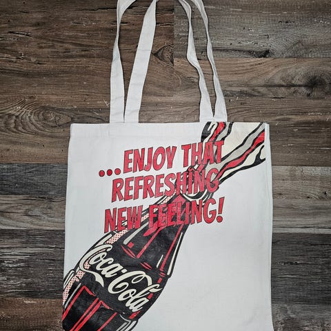 Myydään vanha muovinen coca-cola kassi, koko 50x39. Narukiinnitys.