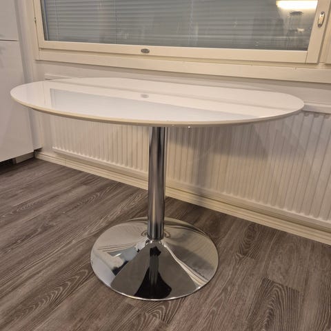 Mustavalkoinen pyöreä ruokapöytä jossa jatkopala. Jonkin verran kulumia, maalilla tai dcfixillä saa siistimmän. Nouto Tammistosta.