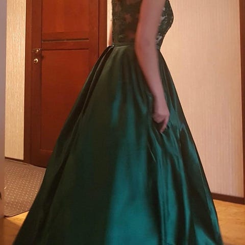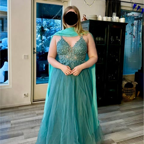 Naisten punainen wanhijenmekko. Yläosa on paljetein koristeltu ja läpikuultavaan verkkoon yhdistetty, jossa on korkealle nouseva kaula-aukko ja hihaton malli. Vyötäröltä alkava pitkä, kerroksellinen tyllihelma luo runsaan siluetin. Sopii juhla- ja iltatilaisuuksiin, kuten vanhojentansseihin tai muihin juhliin.