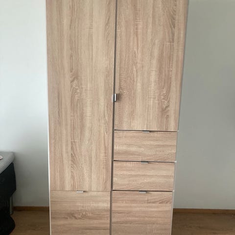 Ikea vaatekaappi, kaksi erillistä. 40€/kaappi tai 70 € yhteensä. Paljon hyllyjä. Sivussa jälki ruuvista. Kaapit voi tietysti sijoittaa niin, että jälki jää sisäpuolelle (meillä ollut tuo sivu seinää päin). Leveys 39,5 tai 79 cm.