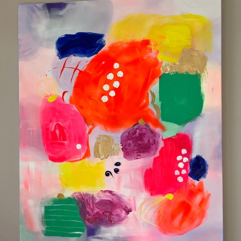 Teoksessa on useita kirkkaita sävyjä, kuten pinkkiä, oranssia, keltaista, vihreää, sinistä ja okraa. Ripaus kultaa, kiehtovia yksityiskohtia. Teos sopii ripustettavaksi pystyyn tai vaakaan.