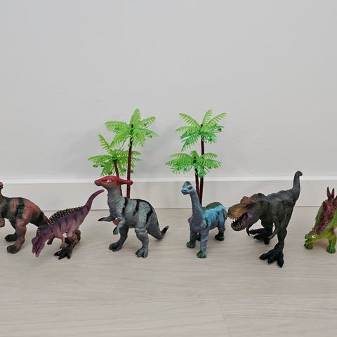 Lapsi myy lelujaan. Dinosaurusfiguuri, joka liikkuu ja ääntää, silmät kiiluu vihreänä.