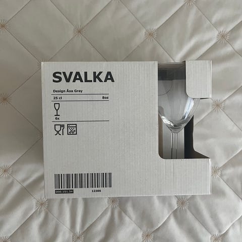 IKEA Svalka viinilasit, pakkaus sisältää 6 kappaletta. Kirkkaat lasiset viinilasit, joissa perinteinen jalallinen muoto. Sopivat esimerkiksi viinin ja muiden juomien tarjoiluun arjessa ja juhlatilaisuuksissa. Lasit ovat konepesun kestäviä valmistajan ohjeiden mukaan.
