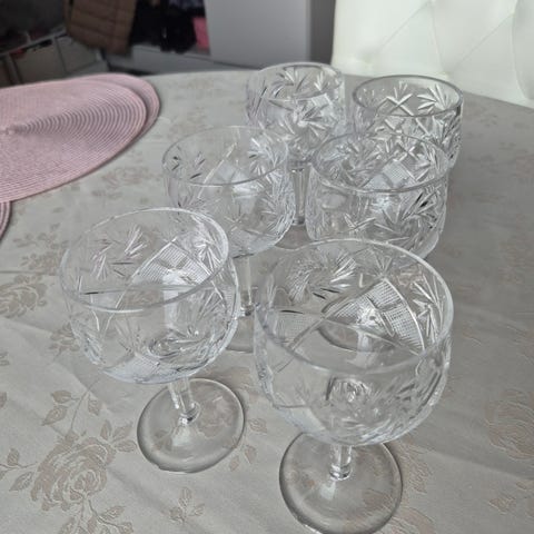 Koboltinsininen kristallilasisetti, johon kuuluu koristehiottu malja, kulho ja useita jalallisia viinilaseja. Lasit ovat kirkkaan jalallisia, yläosa syvän sininen ja kaiverrettu kirkkailla kuvioilla. Malja ja kulho ovat samansävyistä koboltinsinistä kristallia, joissa on hiottuja koristekuvioita. Maljan korkeus on noin 18–20 cm ja halkaisija noin 17–18 cm. Setti soveltuu esimerkiksi kattaukseen, tarjoiluun tai sisustuselementiksi.