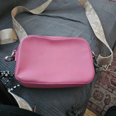 Marimekko pehmeä nahkainen olkalaukku pinkissä värissä. Laukussa on neliömäinen, kompakti muoto ja vetoketjusuljenta ylhäällä ja sisällä pieni vetuketjullinen tasku. Säädettävä, leveä Unikkokuosinen olkahihna kiinnittyy metallisilla klipseillä. Sopii esimerkiksi pienten henkilökohtaisten tavaroiden, kuten puhelimen, lompakon ja avainten kuljettamiseen arjessa tai matkoilla.