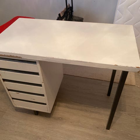 Annetaan suoraan käytöstä kuvien mukainen tukeva kulmamallin työpöytä. Näytön taso nostettavissa pöydän korkeudelle. Näppäimistön tason mekanismi jotenkin rikki, ei rullaudu sujuvasti- jää jumiin välillä. Näppärä osaa varmasti korjata. Vain nouto. Koiratalous.