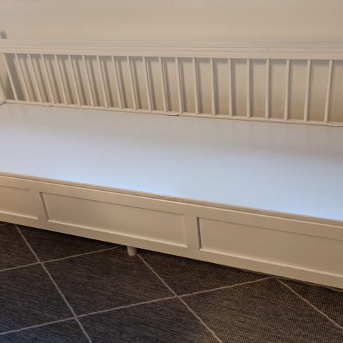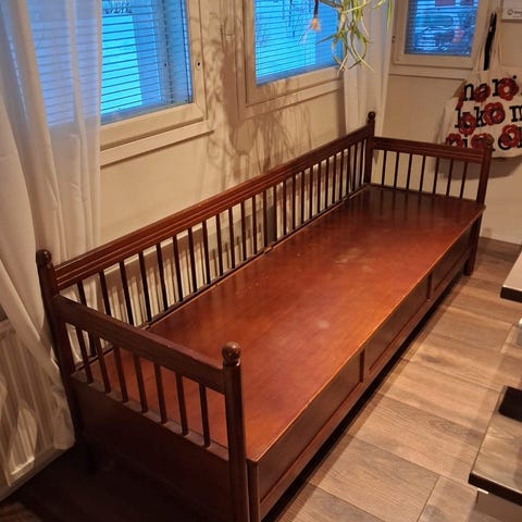 Puusohva ylimääräisenä. On tukeva, mutta pientä käytön jälkeä.