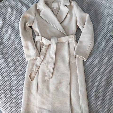 H&M pitkä takki naisille, koko 36. Väri beige. Materiaali polyesteri. Malli on polvipituinen tai hieman pidempi, suoralinjainen ja vyöllä sidottava. Takissa on kaksirivinen napitus edessä sekä olkapoletit. Selässä on vyölenkit ja irrotettava vyö. Käyttämätön ja hintalappu kiinni.