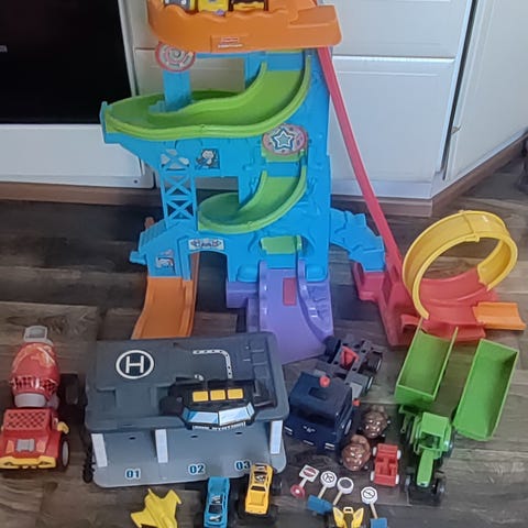 Lapsi myy lelujaan. Kahden auton setti, monsteriauto ja kilpa-auto sekä lavetti. Monsteriauto ääntää.