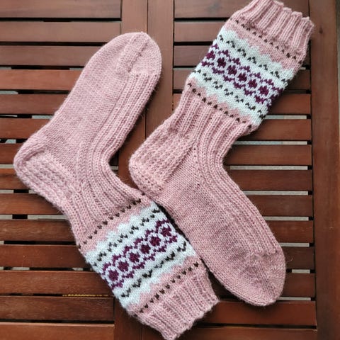 Käsinneulotut kirjavat villasukat.