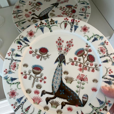 Kaappiin unohtuneet ja käyttämättömät, tarralliset Iittalan Taika Siimes-ruokalautaset, 27 cm, 2 kpl. Design Klaus Haapaniemi.