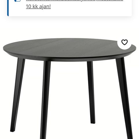 Jyskin Kliplev pyöreä ruokapöytä. Halkaisija 120cm. Uutena ostettu ja ollut käytössä noin 1,5 vuotta. Jonkun verran lapset on saaneet pintaa tuhottua... Myydään suoraan käytöstä, voidaan myös vaihtaa suorakaiteen muotoiseen kuuden hengen pöytään.