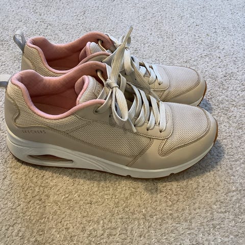 Skechers tennarit, koko 39. Väri vaaleanpunainen (blush) ja valkoinen pohja. Päällinen synteettistä materiaalia, sisäosa tekstiiliä ja kumipohja. Nauhakiinnitys. Soveltuvat arkikäyttöön ja vapaa-aikaan.