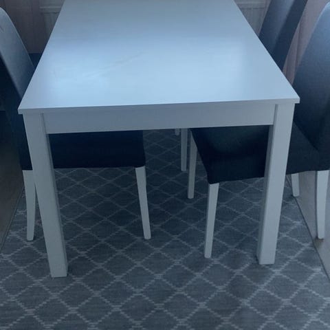 Kuvan tuolit saa halutessaan kaupanpäällisiksi, yhdessä tuolissa koiranpennun aiheuttama jälki jalassa. Tuolit hankittu Askosta.