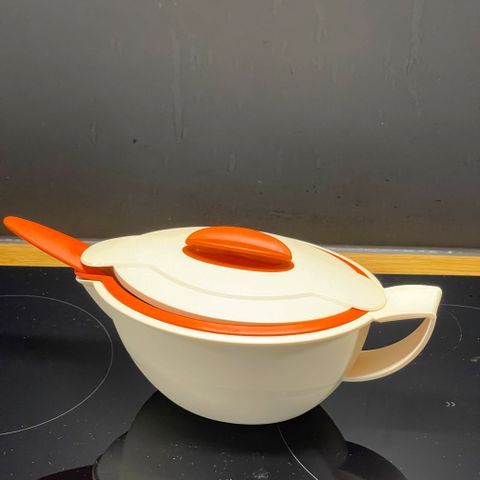 Hyväkuntoinen Tupperin dippikulho. Kulho sipseille, salaatille jne. ja kaksi kannellista dippikulhoa kastikkeille. Kansi toimii muille dippailutarjottaville.