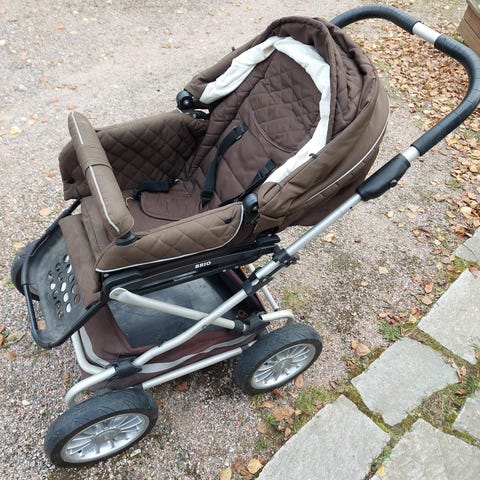 BRIO yhdistelmävaunut ja turvakaukalo. Vaunuissa on runko, ilmakumirenkaat takana ja pienemmät eturenkaat, tavarakori alla sekä vaunukoppa vauvalle. Turvakaukalo kiinnitetään autoon turvavöillä. Sopii vauvan kuljettamiseen sekä vaunuissa että autossa. Värit pääosin musta ja harmaa.
