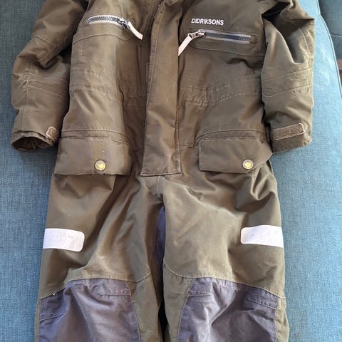 Didriksons lasten haalari, koko 100. Unisex-mallinen haalari, jossa kirjava väritys (mm. vihreää ja tummia vahvikeosia). Materiaali polyesteriä. Haalarissa on huppu, jossa tekoturkisreunus, sekä heijastinyksityiskohtia. Sopii ulkoiluun ja arkipukeutumiseen lapselle, jonka vaatekoko on 100.