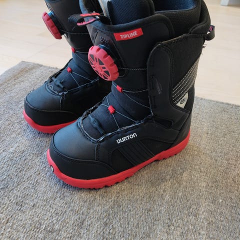 Burton Zipline Boa lasten lumilautakengät, koko 38 (EU) / 6K (US) / 5 (UK) / 24 (JPN). Väri musta punaisilla yksityiskohdilla. Kengissä on Boa-kiristysjärjestelmä, joka mahdollistaa nopean ja tasaisen kiristyksen rullaamalla säätönuppia. Pehmustettu varsi ja sisäosa tuovat tukea ja mukavuutta. Pohja on kumia, joka antaa pitoa lumella ja jäällä. Soveltuu nuorille laskijoille lumilautailuun rinteissä ja muuhun talviseen ulkoiluun.
